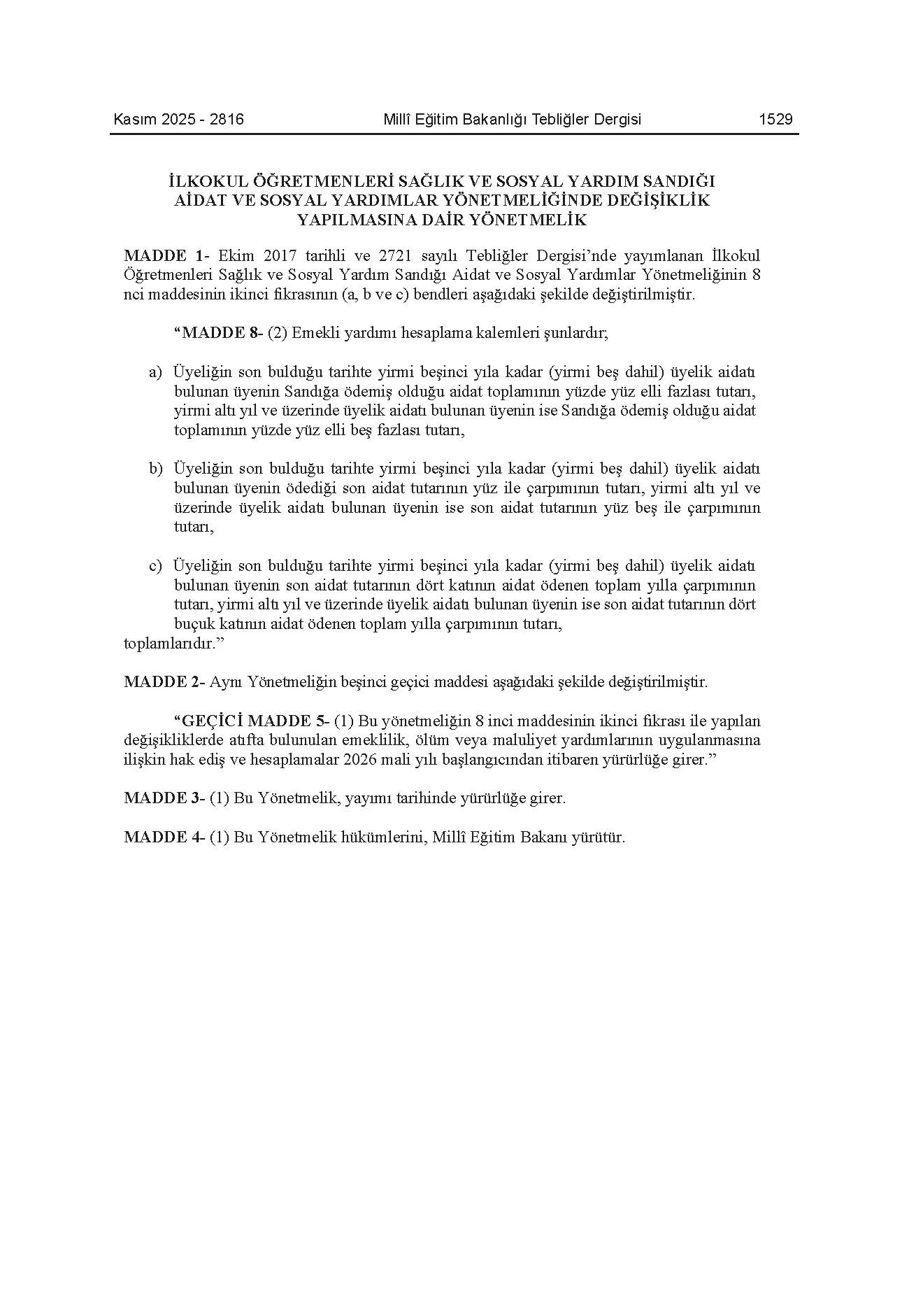Sandığımız 2025 yılı 9 aylık bilanço göstergeleri doğrultusunda oluşan gelir fazlasının, emekli yardımının kademeli olarak iyileştirilmesi sürecine dahil edilmesi maksadıyla Emekli Yardımı Kademeli Artış Sürecinde 2. İyileştirme Kasım 2025 ve 2816 Sayılı Tebliğler Dergisinde yayınlanmış olup; 01.01.2026 tarihinden itibaren yürürlüğe girecektir.