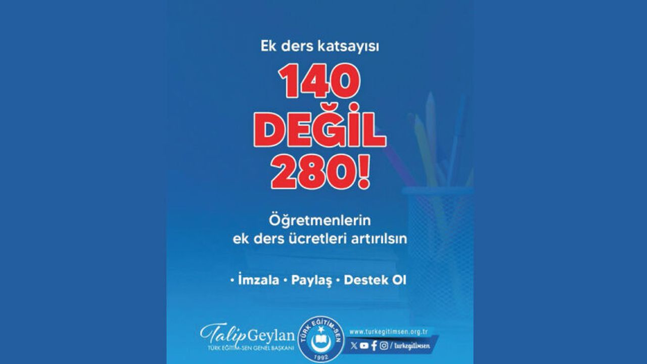 İMZA KAMPANYAMIZA DESTEK OLUN! Türk Eğitim-Sen Genel Merkezi, ek ders ücret ödeme katsayılarının artırılması amacıyla bir imza kampanyası başlattı. http://Change.org üzerinden yürütülen kampanya kapsamında; gündüz öğretimi için ek ders katsayısının 140’tan 280’e, gece öğretimi için ise 150’den 300’e yükseltilmesini talep ediyoruz. https://c.org/d5d9HY7SCm