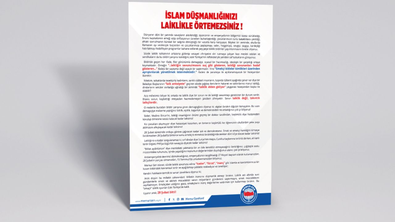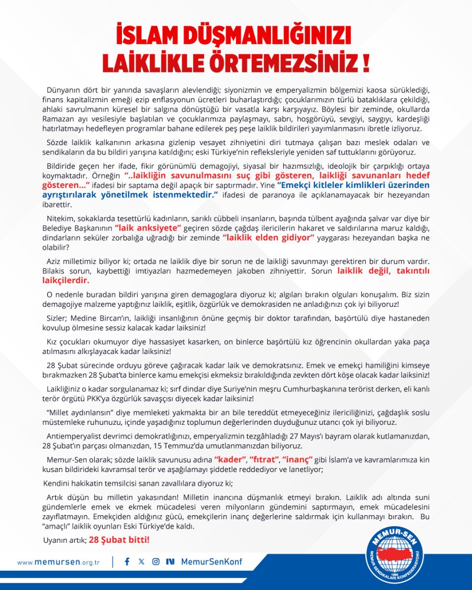 Memur-Sen olarak; sözde laiklik savunusu adına “kader”, “fıtrat”, “inanç” gibi İslam’a ve kavramlarımıza kin kusan bildirideki kavramsal terör ve aşağılamayı şiddetle reddediyor ve lanetliyor;