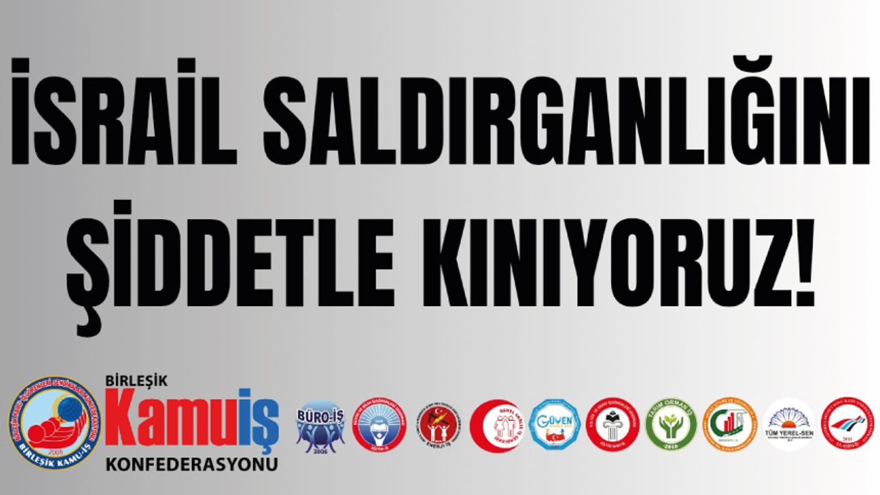 Birleşik Kamu-İş Konfederasyonu olarak ‘yurtta barış, dünyada barış’ ilkemiz doğrultusunda her türlü saldırganlığa karşı olduğumuzu, ülkelerin egemenlik hakkı ve toprak bütünlüğünü desteklediğimizi, Netanyahu yönetimindeki İsrail devletinin uyguladığı terörist tutumu ve yayılmacı politikalarını kabul etmediğimizi dünya kamuoyuna bildiriyor, tüm ülkeleri İsrail-ABD saldırganlığına karşı birleşmeye davet ediyoruz.