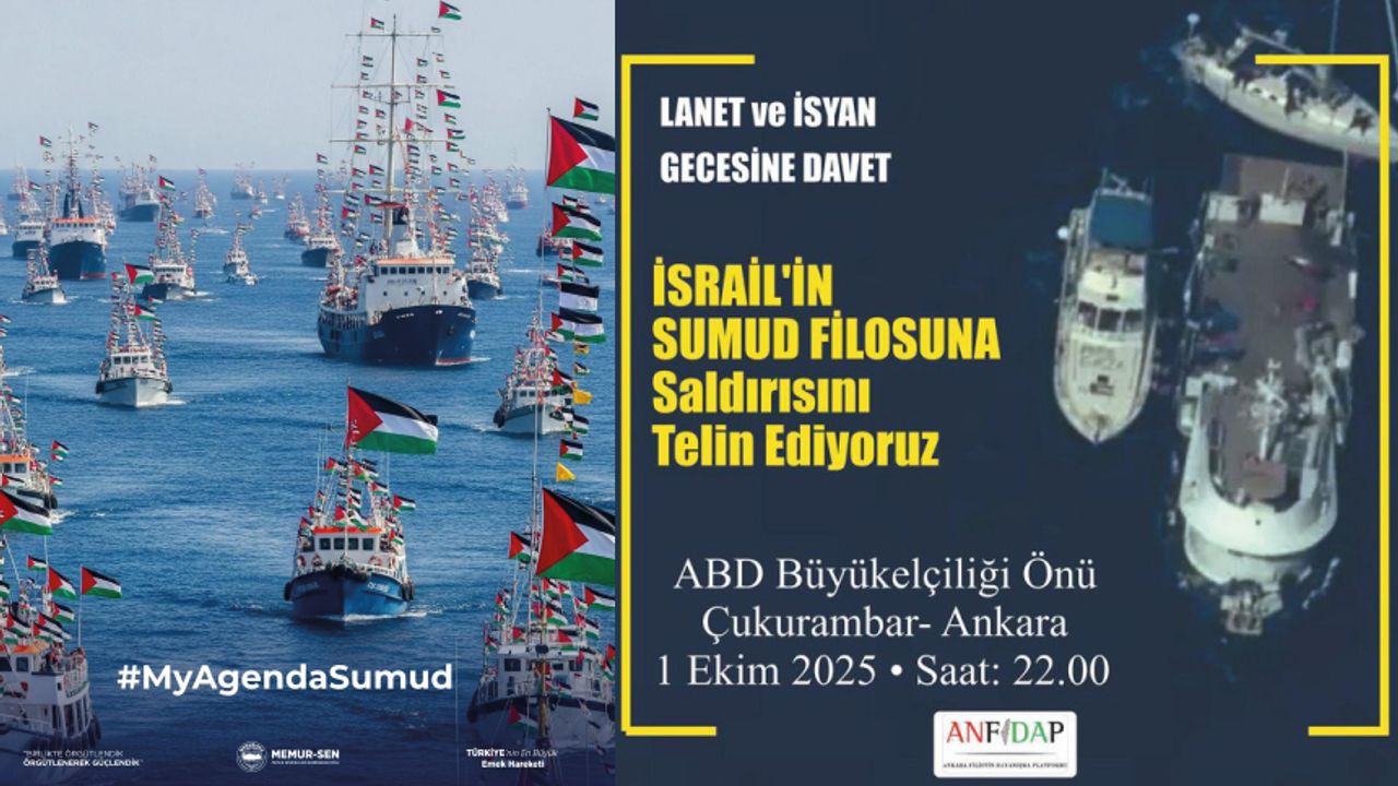 EYLEM DUYURUSU İnsanlık onurunu hedef alan siyonist İsrail’in Sumud Filosuna yönelik saldırısını kınıyor, bu vahşete karşı sesimizi yükseltiyoruz. ABD Büyükelçiliği önü – Çukurambar / Ankara 1 Ekim 2025 (Bugün) 22.00 Memur-Sen olarak bütün üyelerimizi ve aziz milletimizi bu onurlu duruşa davet ediyoruz.