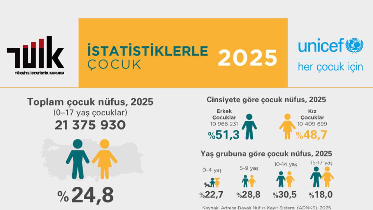 Adrese Dayalı Nüfus Kayıt Sistemi (ADNKS) sonuçlarına göre 31 Aralık 2025 tarihi itibarıyla, Türkiye nüfusu 86 milyon 92 bin 168 kişi iken bunun 21 milyon 375 bin 930'unu çocuklar oluşturdu. Çocuk nüfusun %51,3'ünü erkek çocuklar, %48,7'sini kız çocuklar oluşturdu. Birleşmiş Milletler tanımına göre 0-17 yaş grubunu içeren çocuk nüfus, 1970 yılında toplam nüfusun %48,5'ini oluştururken bu oran 1990 yılında %41,8 ve 2025 yılında %24,8 oldu.