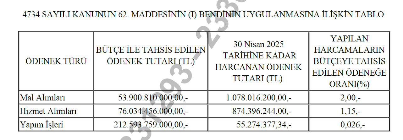 Kamu İhale Kurumu Genel Tebliğine göre, Bakanlığımız 2025 Mali Yılı Bütçesine mal, hizmet alımları ve yapım işleri için tahsis edilen ödenekler ile bu ödeneklerden 30 Nisan 2025 tarihine kadar yapılan harcama bilgileri;