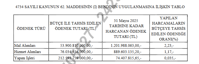 Kamu İhale Kurumu Genel Tebliğine göre, Bakanlığımız 2025 Mali Yılı Bütçesine mal, hizmet alımları ve yapım işleri için tahsis edilen ödenekler ile bu ödeneklerden 31 Mayıs 2025 tarihine kadar yapılan harcama bilgileri;