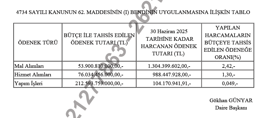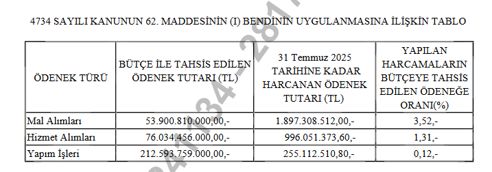Kamu İhale Kurumu Genel Tebliğine göre, Bakanlığımız 2025 Mali Yılı Bütçesine mal, hizmet alımları ve yapım işleri için tahsis edilen ödenekler ile bu ödeneklerden 31 Temmuz 2025 tarihine kadar yapılan harcama bilgileri;