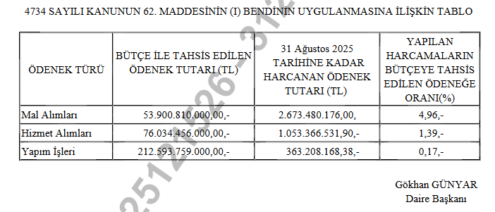 Kamu İhale Kurumu Genel Tebliğine göre, Bakanlığımız 2025 Mali Yılı Bütçesine mal, hizmet alımları ve yapım işleri için tahsis edilen ödenekler ile bu ödeneklerden 31 Ağustos 2025 tarihine kadar yapılan harcama bilgileri;