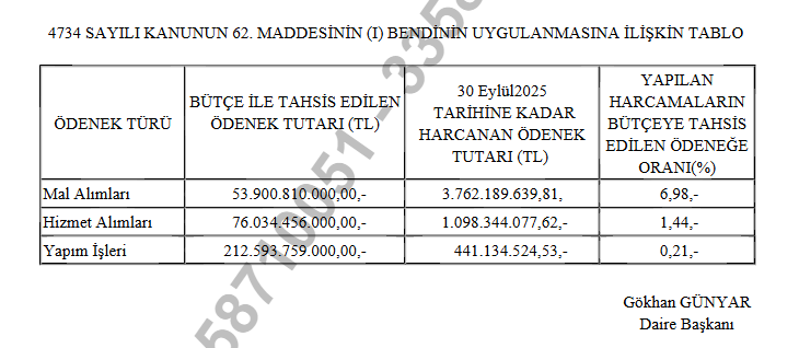 Kamu İhale Kurumu Genel Tebliğine göre, Bakanlığımız 2025 Mali Yılı Bütçesine mal, hizmet alımları ve yapım işleri için tahsis edilen ödenekler ile bu ödeneklerden 30 Eylül 2025 tarihine kadar yapılan harcama bilgileri;