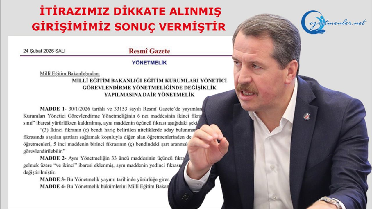 İtirazımız Dikkate Alınmış ve Girişimimiz Sonuç Vermiştir MEB, Eğitim Kurumları Yönetici Görevlendirme Yönetmeliği’nde dava konusu yaptığımız ve yetkili sendika olarak gerekli diplomasiyi yaparak branşı okul öncesi öğretmeni olan yöneticilerin olası mağduriyetine sebebiyet veren yönetmeliğin hükmü