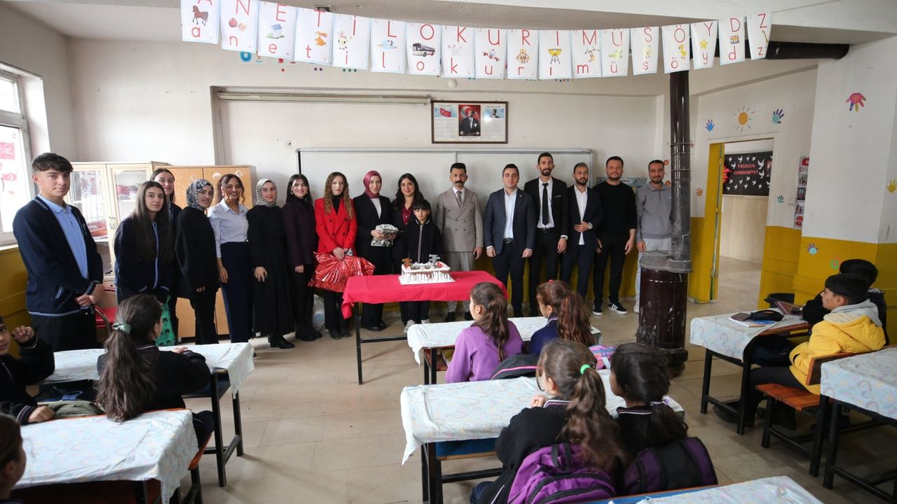 Sınıfta şarkılar eşliğinde hazırladıkları pastayı kesen öğretmen ve öğrenciler, yanlarında götürdükleri hediyeleri takdim ederek unutamayacakları anlar yaşattı.