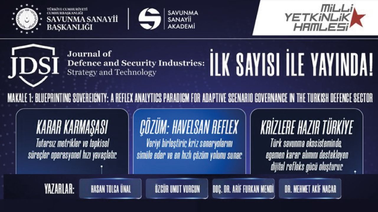 JDSI’nin ilk sayısında yer alan Dijital Egemenlik: Türk Savunma Sektörü için Refleks Analitiği çalışması Türkiyenin savunma sektöründe refleksif karar alma, çok alanlı veri füzyonu ve yapay zekâ destekli senaryo analizinin stratejik etkilerini ele alıyor. Geliştirilen entegre analitik platform; * karar alma sürelerini kısaltmayı, * belirsizlik altında politika güvenini artırmayı, * kurumsal uyum ve izlenebilirliği güçlendirmeyi hedefliyor. Kapsamlı simülasyonlar ve duyarlılık analizleriyle desteklenen bulgular, dijital yönetişim ve stratejik kapasite geliştirme açısından önemli bulgular sunuyor.