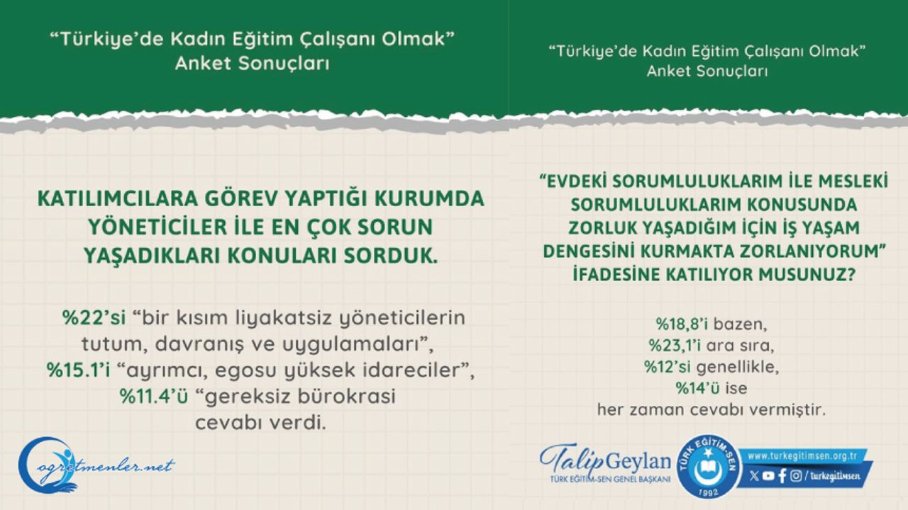 Kadın eğitim çalışanlarının %67,9’u evdeki sorumlulukları ile mesleki sorumlulukları konusunda zorluk yaşadığı için iş yaşam dengesini kurmakta zorlanıyor.