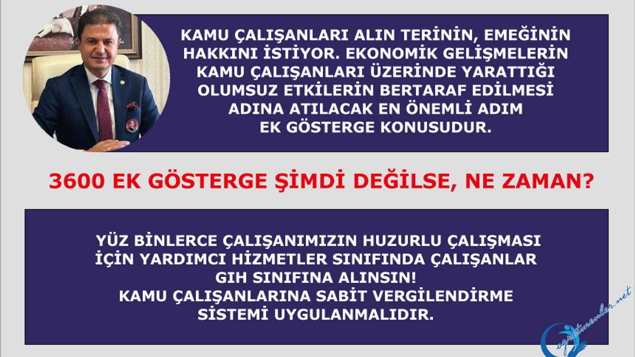 Dolgun, “1.dereceye inmiş kamu çalışanlarının 3600 ek gösterge verilmesi konusunda henüz bir gelişme yok. Sözde yetkili sendikanın marifetiyle sürüncemede kaldı. Bilindiği gibi 3600 ek gösterge konusu Cumhurbaşkanımızın 2023 seçimlerinde bir vaadi idi. Hatta dönemin Çalışma ve Sosyal Güvenlik Bakanı Vedat Bilgin de konu hakkındaki kanun teklifinin hazır olduğunu belirtmişti. Ne var ki, bugüne kadar bu yönde atılmış herhangi bir adım olmadığını görmekteyiz. Devlette devamlılık esastır. Bu doğrultuda Sayın Cumhurbaşkanımızın seçimler öncesinde verdiği sözün gereği yerine getirilmelidir. Ekonomik gelişmelerin kamu çalışanları üzerinde yarattığı olumsuz etkilerin bertaraf edilmesi adına atılacak en önemli adım ek gösterge konusudur.” diye konuştu.