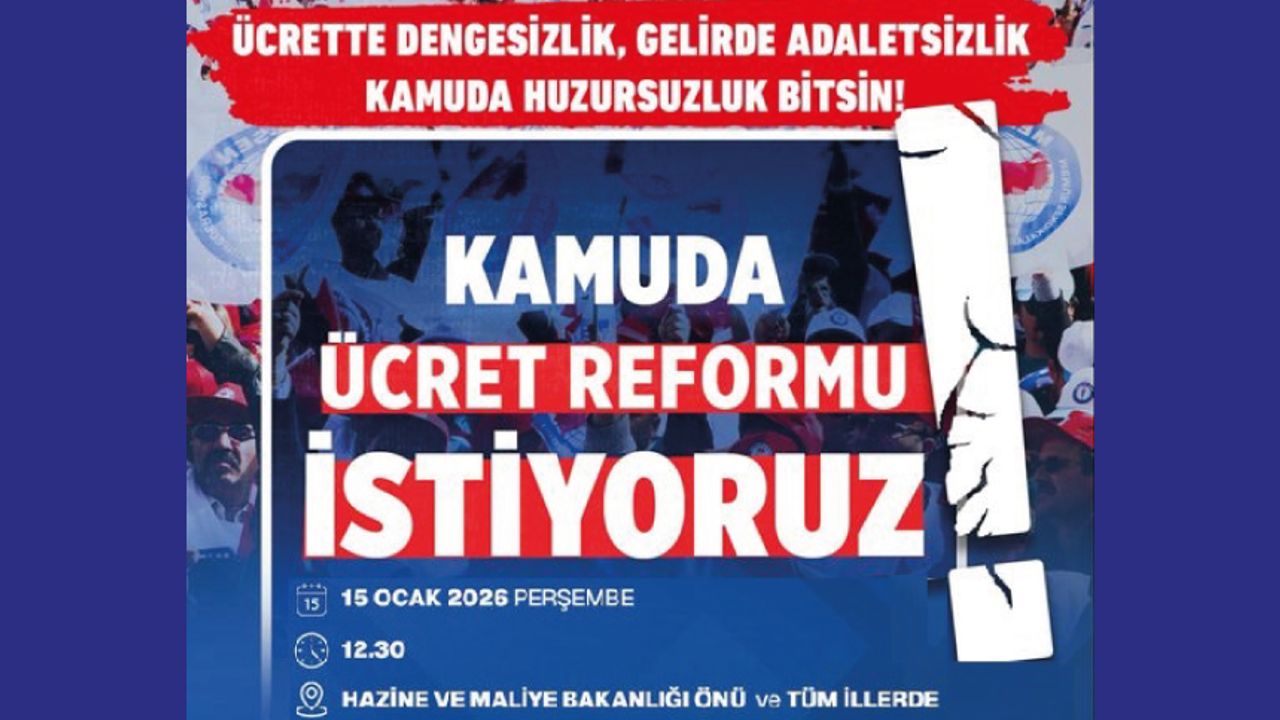 026 yılının ilk maaş günü 15 Ocak 2026 tarihinde kamudaki ücret adaletsizliğini bir kez daha haykırmak için, alın terimizin karşılığını almak için hak için, emek için, adalet için Ankara’da Hazine ve Maliye Bakanlığı önü ile tüm illerde kitlesel eylemler ve basın açıklaması gerçekleştireceğiz. Tüm basın mensuplarını, kamu çalışanlarını ve kamuoyunu, emeğin sesine ortak olmaya davet ediyoruz. Tarih: 15.01.2026 Saat: 12:30 Yer: Ankara Hazine ve Maliye Bakanlığı Önü