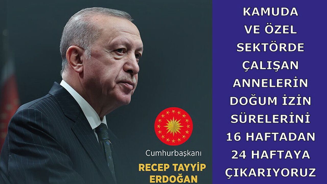 Cumhurbaşkanı Erdoğan, geçen hafta Meclis'e bir kanun teklifi ilettiklerini anımsatarak, "Buna göre, kamuda ve özel sektörde çalışan annelerin doğum izin sürelerini 16 haftadan 24 haftaya çıkarıyoruz. Aynı düzenlemede özel sektör çalışan babaların babalık iznini de kamuda olduğu gibi 5 günden 10 güne çıkarmayı amaçlıyoruz. Bayramdan sonra yasalaşmasını ümit ettiğimiz teklifin şimdiden tüm anne babalara hayırlı olmasını diliyorum." dedi.
