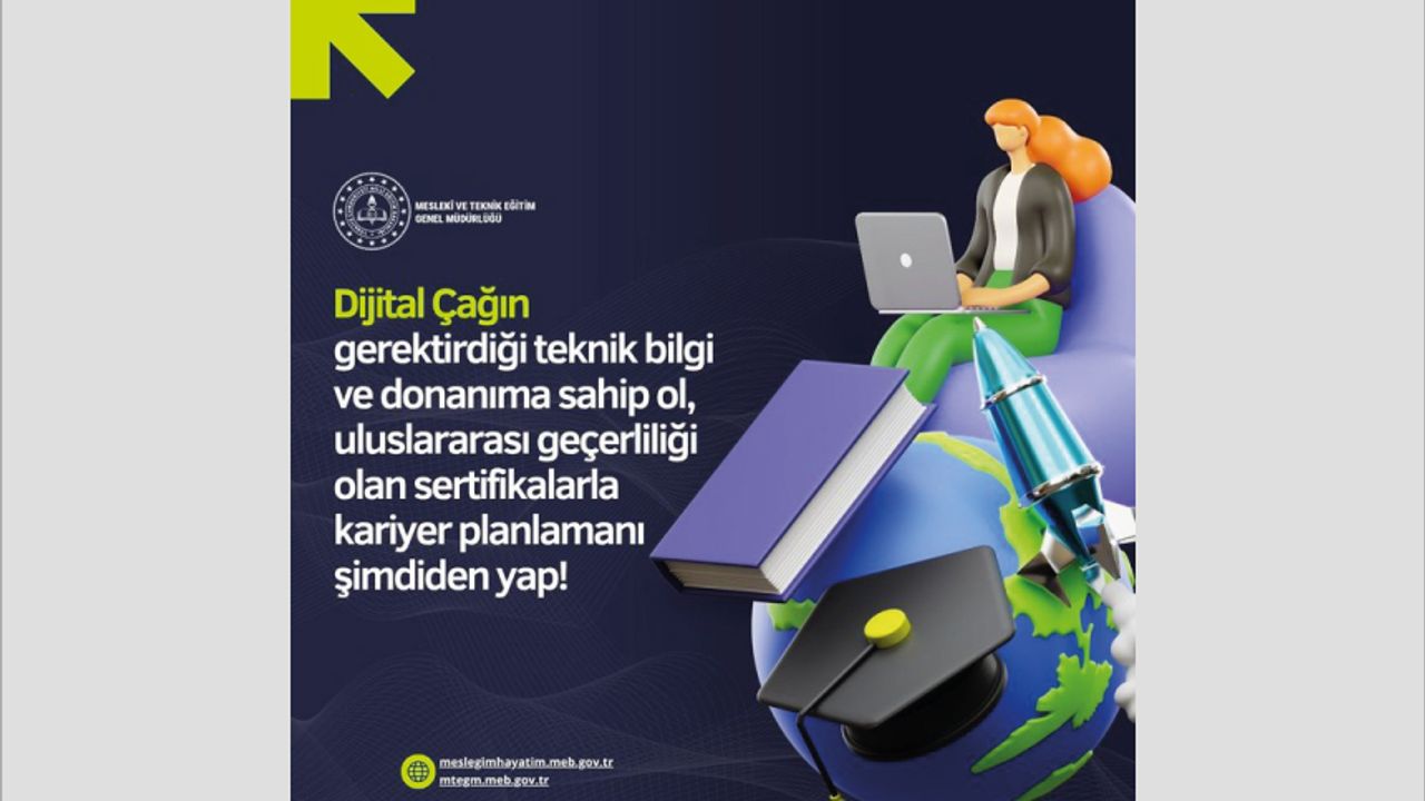 Sevgili Gençler, Dijital Çağın sunduğu fırsatları yakalamak için, teknik bilgi ve donanımınızı uluslararası standartlara taşıyın. Kariyer vizyonunuzu, uluslararası geçerliliği olan sertifikalarla şimdiden gerçeğe dönüştürün. Tüm detaylar için web sitemizi ziyaret edin: http://meslegimhayatim.meb.gov.tr http://mtegm.meb.gov.tr