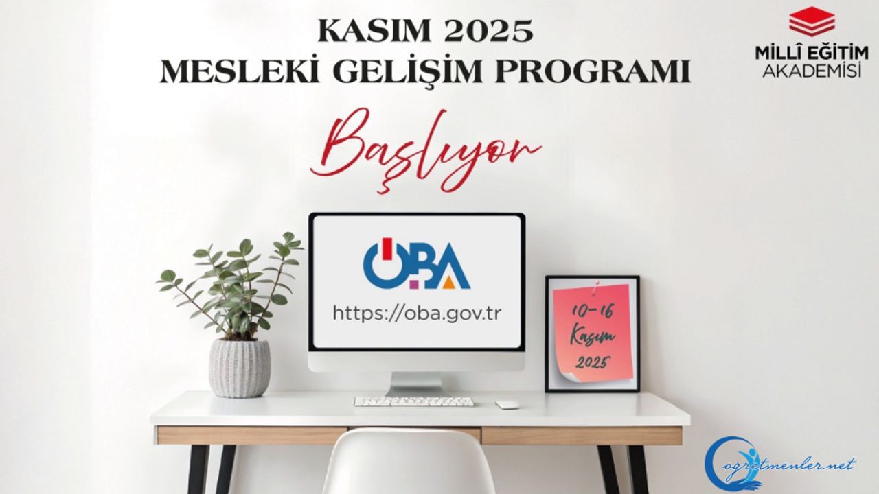 Bu kapsamda eğitim kurumlarında görevli yönetici ve öğretmenler, ÖBA platformu üzerinden 10 Kasım 2025 Pazartesi günü saat 08.00 ile 16 Kasım 2025 Pazar günü saat 23.59 saatleri arasında yayımda olacak "Kasım 2025 Mesleki Çalışmalar Semineri"ni tamamlamaları durumunda Kasım 2025 dönemi mesleki çalışmalarını yapmış sayılacaklar.