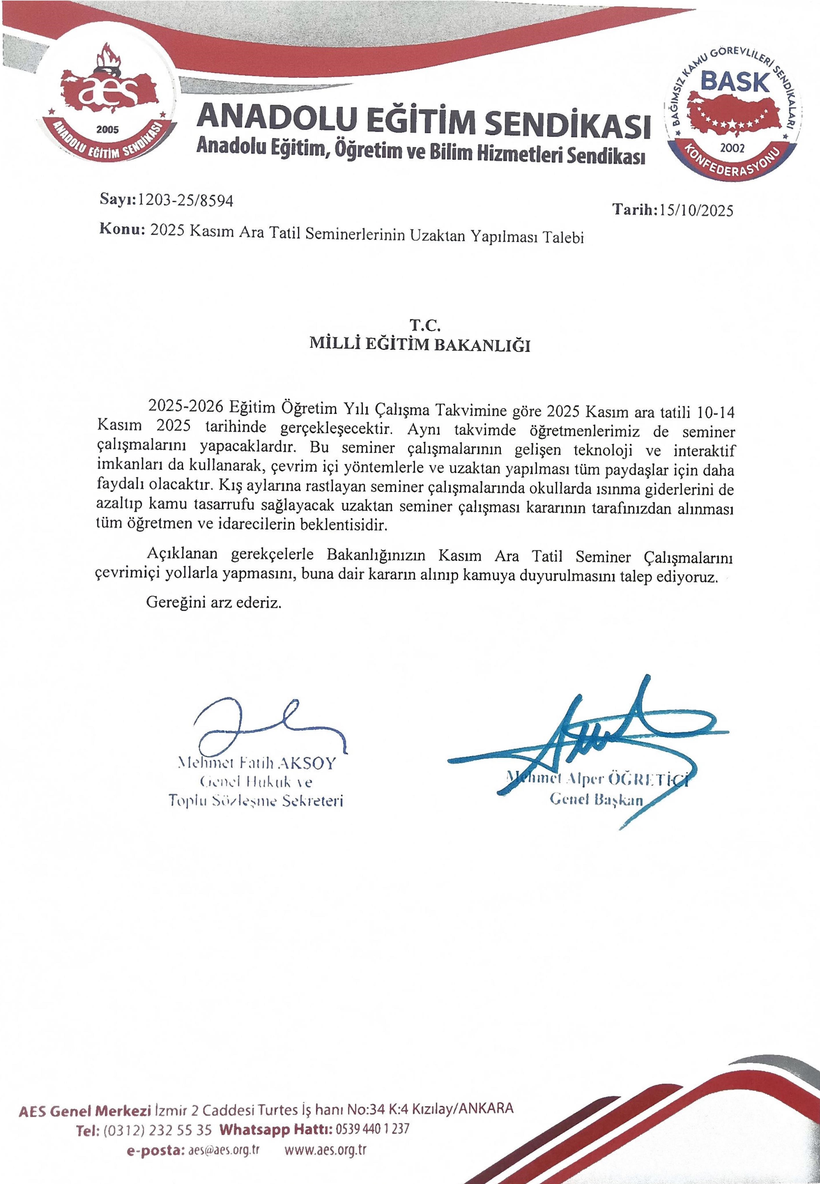 Anadolu Eğitim Sendikası olarak yukarıda açıklanan konu ile ilgili Bakanlığa talepte bulunduk.