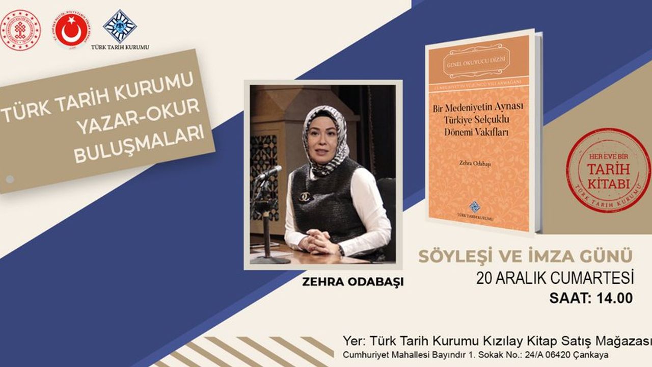 Kızılay kitap satış mağazamız #YazarOkurBuluşmaları'na ev sahipliği yapmaya devam ediyor. Genel Okuyucu Dizimiz kapsamında "Bir Medeniyetin Aynası Türkiye Selçuklu Dönemi Vakıfları" başlıklı eseri kaleme alan Zehra Odabaşı 20 Aralık Cumartesi düzenlenecek söyleşi ve imza günüyle okurlarıyla buluşacak.