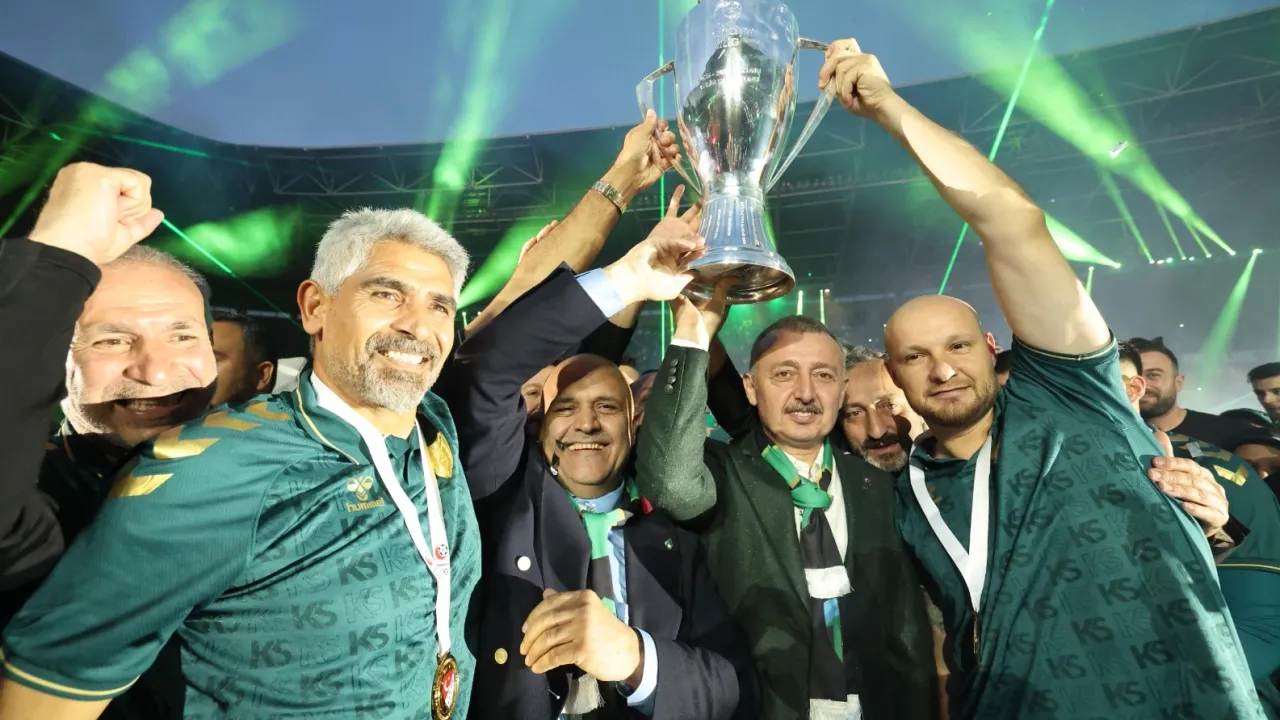 Kocaelispor’un şampiyonluk gecesinde yer Yeşil, gök Siyah oldu. Kupa töreninde Yeşil-Siyahlı taraftarların alkışları eşliğinde platforma gelen Kocaeli Büyükşehir Belediye Başkanı Doç.Dr.Tahir Büyükakın, “Bu başarıda en büyük pay taraftarındır” diyerek, tribünlere şampiyonluk üçlüsü çektirdi.KOCAELİ (İGFA) - Trendyol 1.Lig’de büyük bir başarı hikâyesine imza atarak Süper Lig’e yükselen Kocaelispor’un şampiyonluğu coşkulu bir kalabalıkla kutlandı.