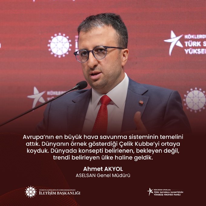 ASELSAN Genel Müdürü Ahmet Akyol, hava savunma alanındaki projelere dikkat çekerek, “Avrupa’nın en büyük hava savunma sisteminin temelini attık. Dünyanın örnek gösterdiği Çelik Kubbe’yi ortaya koyduk. Dünyada konsepti belirleyen, bekleyen değil, trendi belirleyen ülke hâline geldik.” değerlendirmesinde bulundu.
