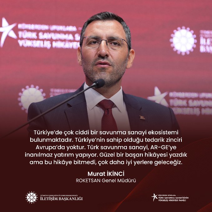 ROKETSAN Genel Müdürü Murat İkinci, Türkiye’de güçlü bir ekosistemin bulunduğunu vurgulayarak, “Türkiye’de çok ciddi bir savunma sanayi ekosistemi bulunmaktadır. Türkiye’nin sahip olduğu tedarik zinciri Avrupa’da yoktur. Türk savunma sanayi, AR-GE’ye inanılmaz yatırım yapıyor. Güzel bir başarı hikâyesi yazdık ama bu hikâye bitmedi, çok daha iyi yerlere geleceğiz.” ifadelerini kullandı.