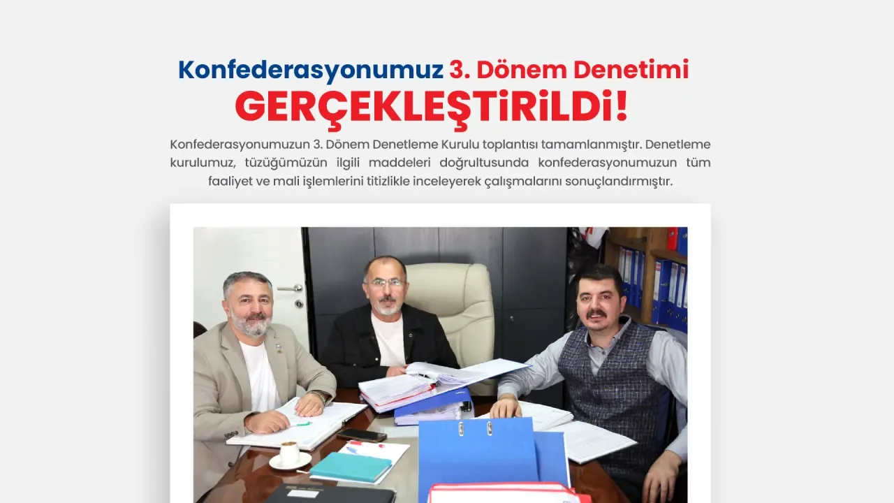 Konfederasyonumuzun 3. Dönem Denetleme Kurulu toplantısı tamamlanmıştır. Denetleme Kurulu Başkanı Uğurcan Küçükala, Denetleme Kurulu Raportörü Özgür Işık ve Denetleme Kurulu Üyesi Uğur Solak’ın bulunduğu Denetleme Kurulumuz, tüzüğümüzün ilgili maddeleri doğrultusunda konfederasyonumuzun tüm faaliyet ve mali işlemlerini titizlikle inceleyerek çalışmalarını sonuçlandırmıştır.