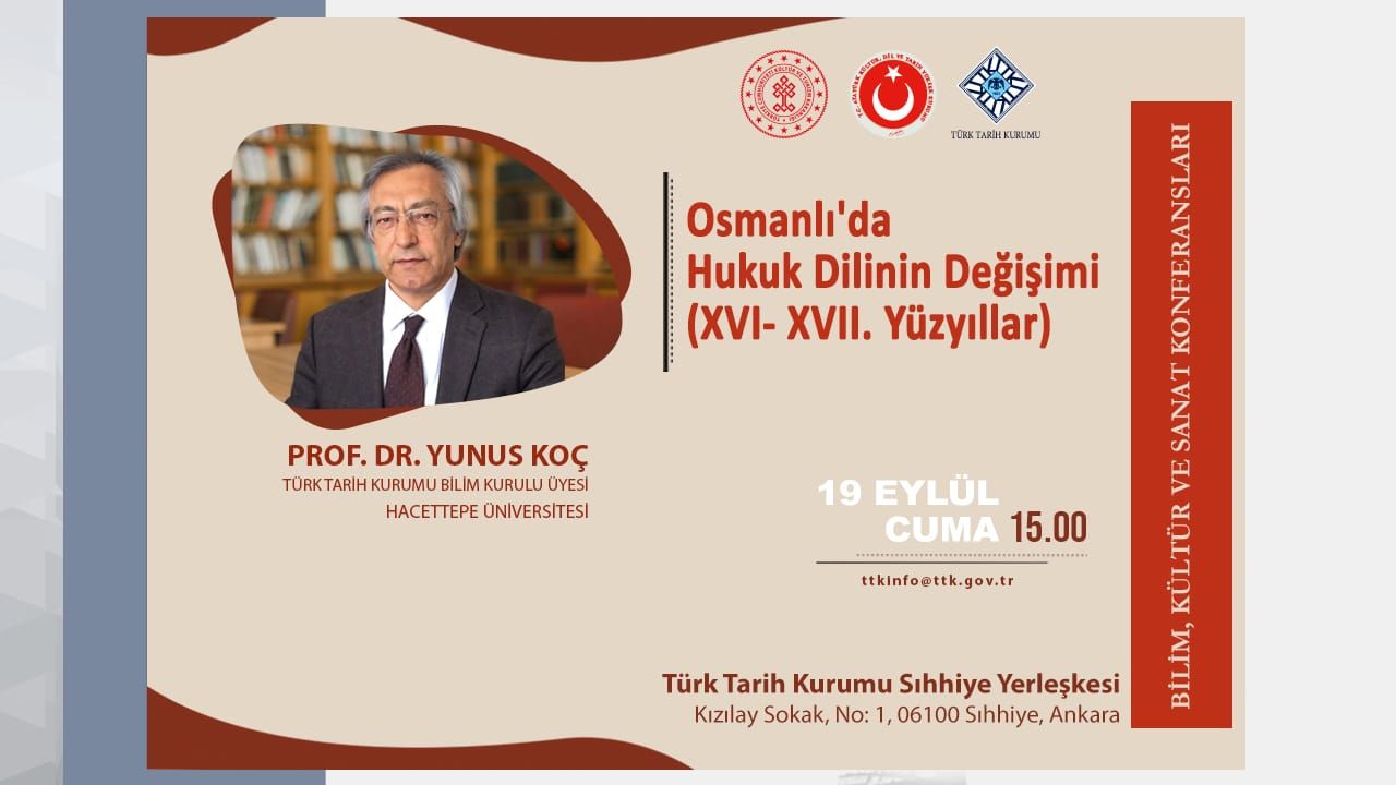 Kurumumuz tarafından düzenlenen “Bilim, Kültür ve Sanat Konferansları” serisi kapsamında Prof. Dr. Yunus Koç’un Sıhhiye yerleşkemizde 19 Eylül Cuma günü vereceği “Osmanlı’da Hukuk Dilinin Değişimi (XVI ve XVII. Yüzyıllar)” konferansına davetlisiniz.