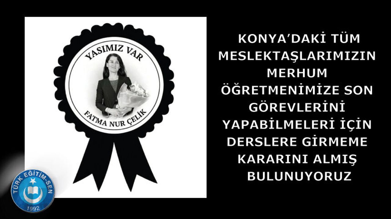 Fatma Nur öğretmenimizi yarın onbinlerin duasıyla uğurlayacağız! Fatma Nur Çelik öğretmenimiz bugün görev yeri olan Çekmeköy Taşdelen Borsa İstanbul Mesleki ve Teknik Anadolu Lisesi’nden binlerce meslektaşının duasıyla defnedileceği memleketi Konya’ya uğurlandı. Yarın Konya’daki tüm meslektaşlarımızın merhum öğretmenimize son görevlerini yapabilmeleri için derslere girmeme kararını almış bulunuyoruz. Allah rahmet eylesin, mekanı Cennet olsun. Ailesine ve eğitim camiamıza başsağlığı diliyoruz.