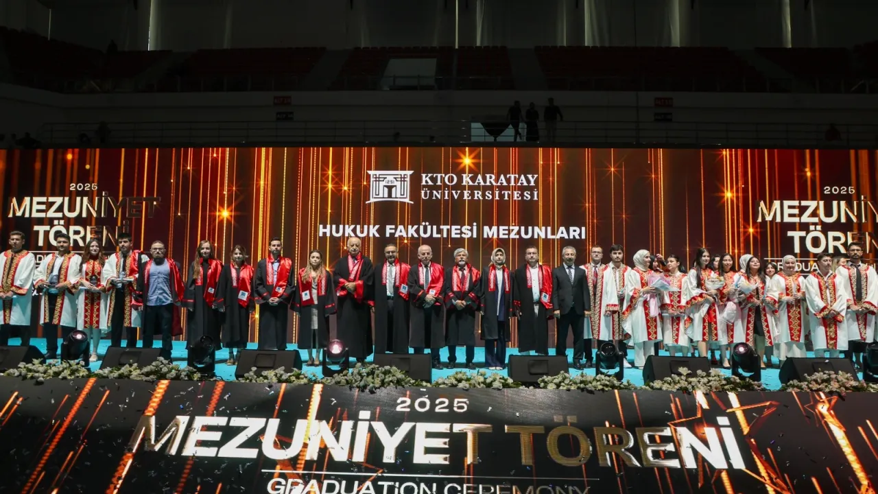 KTO Karatay Üniversitesi, 2024-2025 mezunlarını Karatay Spor ve Kongre Merkezi’nde düzenlenen törenle uğurladı. Törende 1.680 mezuna diplomaları verilirken, üniversite birincisi Durmuş Ali Kırıcıoğlu’na plaketi takdim edildi.KONYA (İGFA) - KTO Karatay Üniversitesi’nin 2024-2025 Mezuniyet Töreni, Karatay Spor ve Kongre Merkezi’nde yapıldı. Törene Konya Büyükşehir Belediye Başkanı Uğur İbrahim Altay, KTO Karatay Üniversitesi Mütevelli Heyeti Başkanı Selçuk Öztürk, Ankara İl Emniyet Müdürü Engin Dinç, Rektör Prof. Dr. Fevzi Rifat Ortaç, akademisyenler, mezunlar ve aileleri katıldı. Kur’an-ı Kerim tilaveti ve İstiklal Marşı ile başlayan program, protokol konuşmalarıyla devam etti.