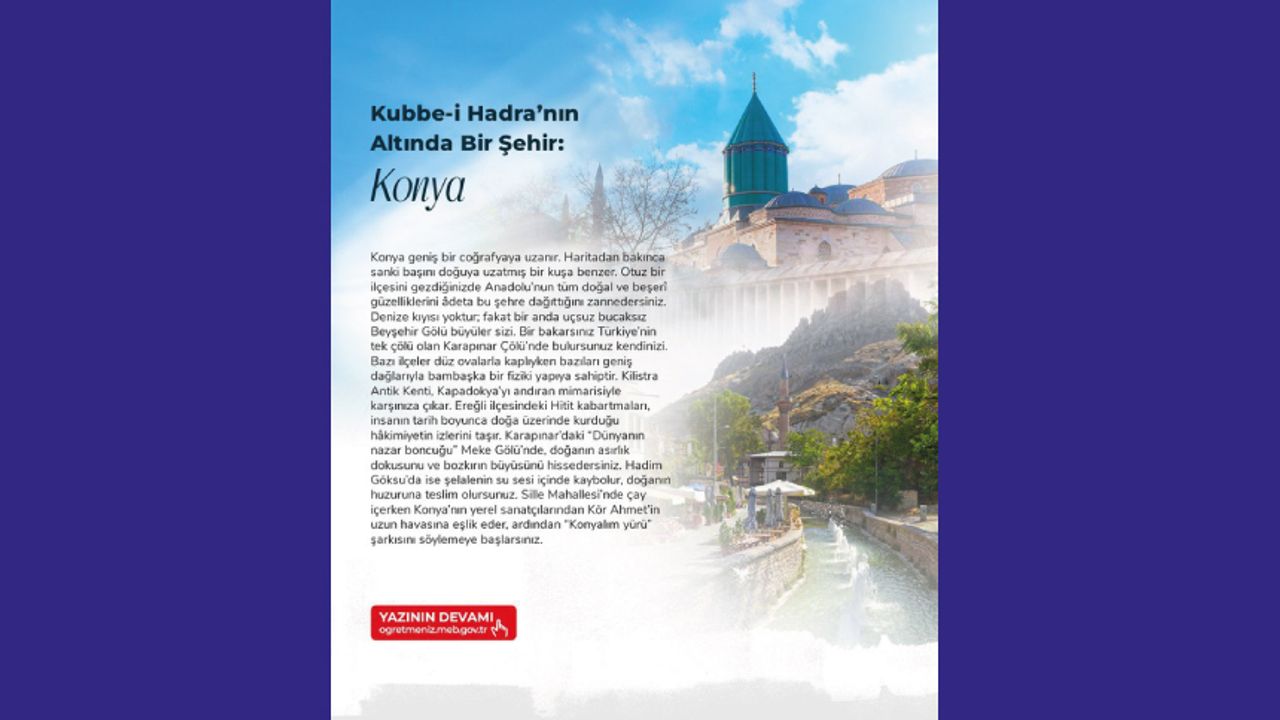 Abdullah AYDEMİR’den “Kubbe-i Hadra’nın Altında Bir Şehir: Konya” seyahat yazısı ÖğretmenİZ dergisinde! Bazı şehirler yalnızca gezilmez, dinlenir, hissedilir ve hatırlanır… Konya da tarihi ve maneviyatıyla konuşan şehirlerden biri. “Kubbe-i Hadra’nın Altında Bir Şehir: Konya”; Beyşehir Gölü’nden Karapınar Çölü’ne, Sille’den Alaaddin Tepesi’ne, Mevlana’nın yeşil kubbesinden Selçuklu izlerine uzanan çok katmanlı bir yolculuk sunuyor. Yazı; Konya’nın coğrafi çeşitliliğini, kültürel mirasını, sokak dilini, mutfağını ve insan sıcaklığını sade ve derin bir anlatımla okura aktarıyor. Bu seyahat yazısı; bir şehri hafıza, inanç ve insan ilişkileriyle örülü canlı bir bütün olarak okumaya davet ediyor. Okuru, Kubbe-i Hadra’nın gölgesinde kendi iç yolculuğuna çıkmaya çağırıyor.