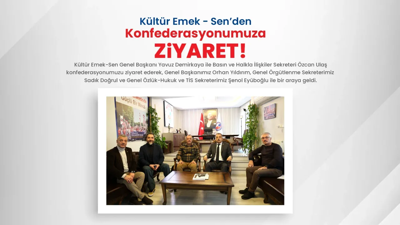 Kültür Emek-Sen Genel Başkanı Yavuz Demirkaya ile Basın ve Halkla İlişkiler Sekreteri Özcan Ulaş konfederasyonumuzu ziyaret ederek, Genel Başkanımız Orhan Yıldırım, Genel Örgütlenme Sekreterimiz Sadık Doğrul ve Genel Özlük-Hukuk ve TİS Sekreterimiz Şenol Eyüboğlu ile bir araya geldi.