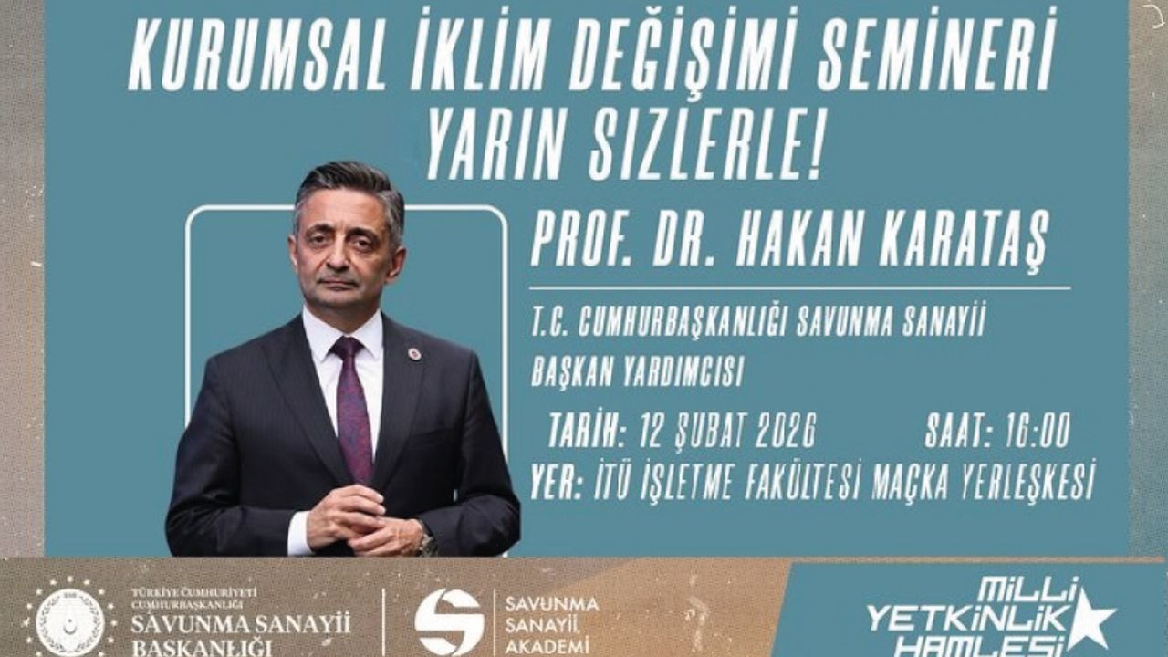 iş birliğiyle yürüttüğümüz Savunma Sanayiinde İşletme (MBA) Programı kapsamında @SavunmaSanayii Başkan Yardımcısı @drhkaratas“Kurumsal İklim Değişimi” temalı seminerinde buluşuyoruz. İTÜ İşletme Fakültesi ev sahipliğinde gerçekleşecek seminere İstanbul Teknik Üniversitesi’nin tüm öğrencileri davetlidir. Tarih: 12 Şubat 2026 Saat: 16.00 Yer: İTÜ İşletme Fakültesi Maçka Yerleşkesi #MilliYetkinlikHamlesi#SavunmaSanayiindeİşletme