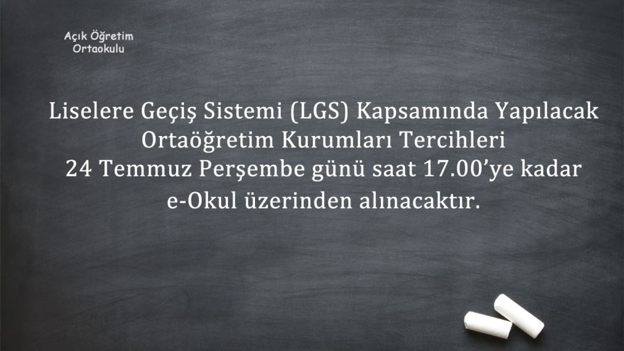 Liselere Geçiş Sistemi (LGS) kapsamında yapılacak ortaöğretim kurumları tercihleri 24 Temmuz Perşembe günü saat 17.00'ye kadar e-Okul üzerinden alınacaktır.