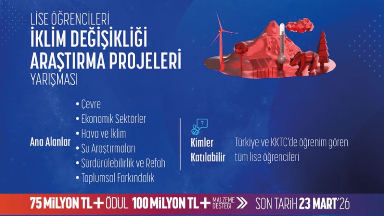 İklim değişikliğinin olumsuz etkilerine karşı çözümler üreten gençlerimiz yarışıyor! Gençlerimizin iklim değişikliği konusundaki farkındalıklarını artırarak, öğrencilerimizi doğal kaynakların sürdürülebilir kullanımına yönlendirmeyi amaçladığımız; Lise Öğrencileri İklim Değişikliği Araştırma Projeleri Yarışmamıza başvurularınızı bekliyoruz!