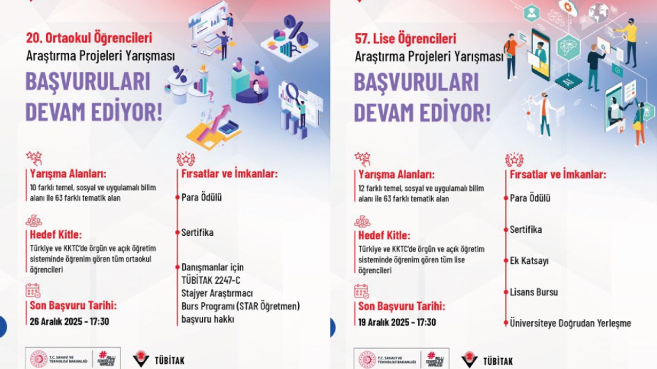 2026 Yılı 2204-A Lise Öğrencileri Araştırma Projeleri Yarışması başvuruları devam ediyor! Biyolojiden tarihe, teknolojik tasarımdan yazılıma toplam 12 ana alanda araştırma projenizi hazırlayabilir; ülkemizin geleceğini bilim ve teknolojiyle şekillendirebilirsiniz. Son başvuru tarihi: 19 Aralık 2025 17.30