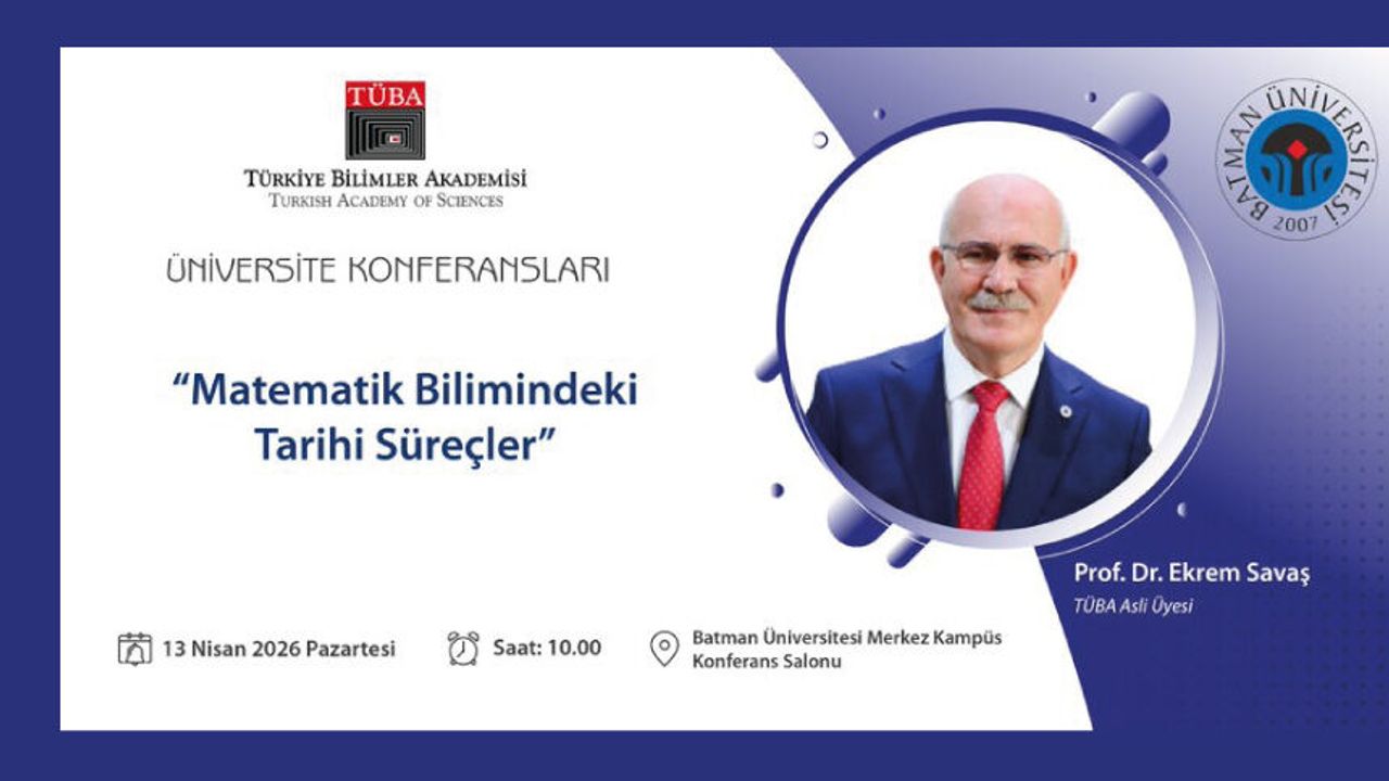 TÜBA Asli Üyesi Prof. Dr. Ekrem Savaş, TÜBA Üniversite Konferansları Programı kapsamında Batman Üniversitesi Merkez Kampüs Konferans Salonu'nda 13 Nisan 2026 tarihinde saat 10.00’da “Matematik Bilimindeki Tarihi Süreçler” konulu konferans verecek.