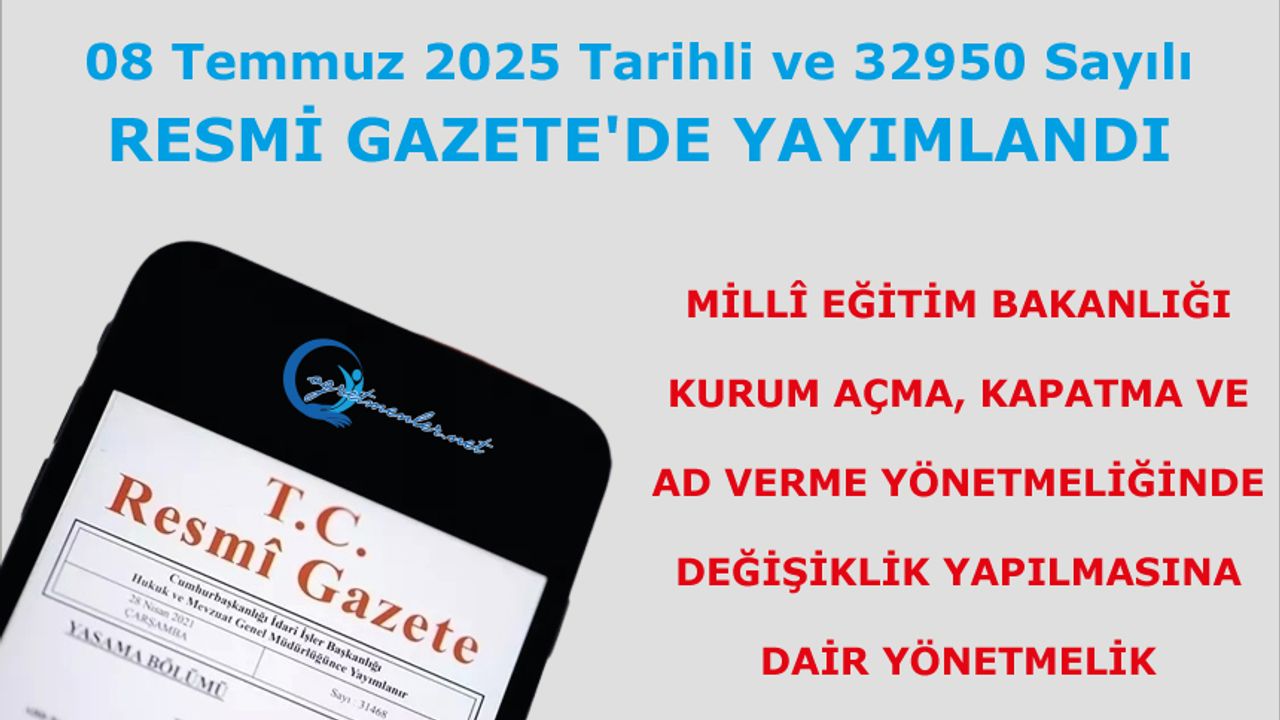 MİLLÎ EĞİTİM BAKANLIĞI KURUM AÇMA, KAPATMA VE AD VERME YÖNETMELİĞİNDE DEĞİŞİKLİK YAPILMASINA DAİR YÖNETMELİK