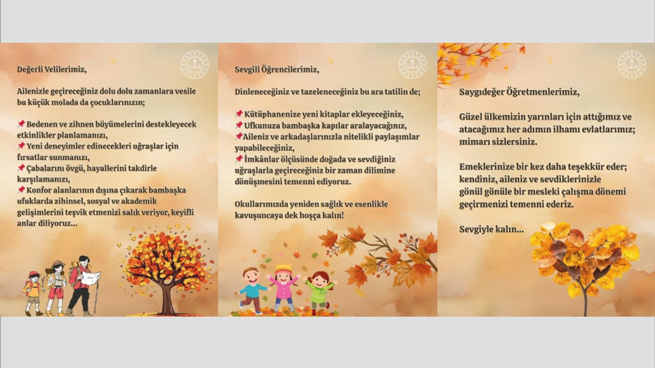 *Sevgili Öğrencilerim,* 17 Kasım Pazartesi günü okullarımızda yeniden buluşuncaya kadar dinlenirken öğrenmeyi de sürdüreceğiniz verimli ve keyifli bir ara tatil diliyorum. Bu süreçte sizler için hazırladığımız zengin dijital içeriklerden istifade etmenizi ve MEBİ platformunu mutlaka ziyaret etmenizi tavsiye ediyorum. Unutmayın; hem eğlenerek öğrenebileceğiniz hem de kendinizi geliştirebileceğiniz pek çok içerik sizleri bekliyor! *Kıymetli Meslektaşlarım,* Bakanımız Sayın Yusuf Tekin’in de dediği gibi: “Eğitimin öznesi öğretmenlerdir.” Türkiye Yüzyılı’nın inşasında en büyük gücümüz sizlersiniz. Çevrim içi olarak gerçekleştirilecek seminer çalışmalarınızda kolaylıklar ve başarılar diliyorum. *Değerli Velilerimiz,* Eğitim yolculuğumuzun her aşamasında bizlere verdiğiniz destek için teşekkür ediyor, evlatlarınızın öğrenmeye ve keşfetmeye olan çabalarına katkı sağlamaya devam edeceğiniz huzurlu bir ara tatil diliyorum. Türkiye Yüzyılı Maarif Modeli rehberliğinde, yeniden buluşmak dileğiyle…
