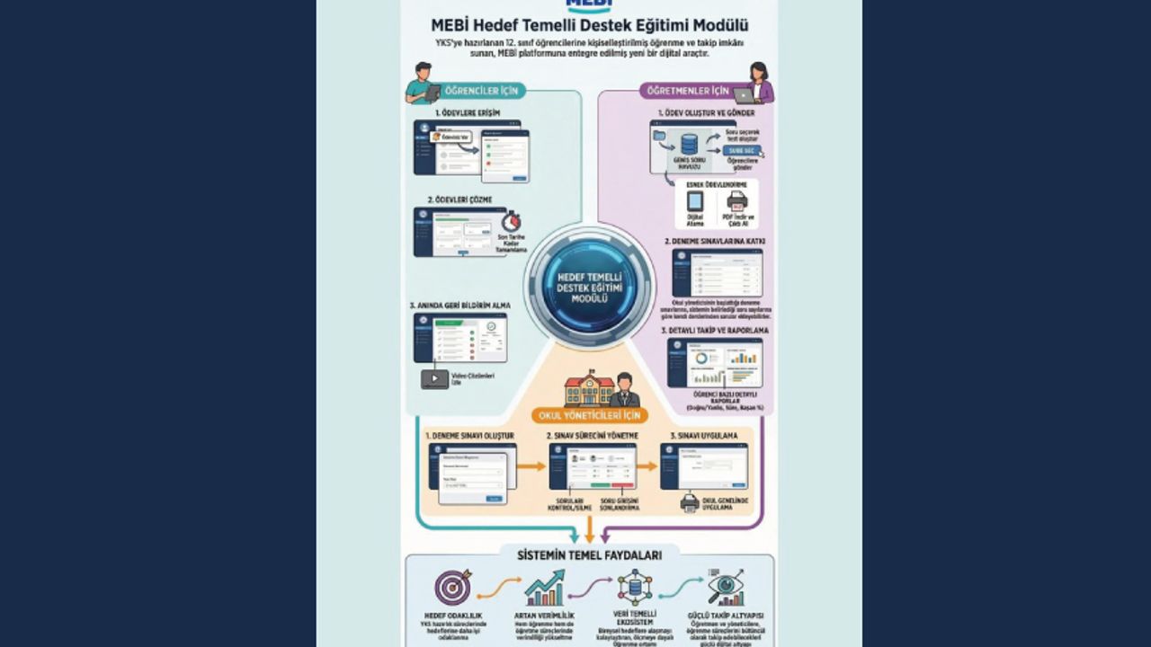 MEBİ’de Yeni Modül: Hedef Temelli Destek Eğitimi 12. sınıf öğrencilerimizin yükseköğretime hazırlık sürecini güçlendirmek amacıyla Hedef Temelli Destek Eğitimi Modülünü MEBİ’de kullanıma açıldı. Modülle birlikte artık: Dijital ödev gönderme Test hazırlama ve çıktı alma Okul denemesi oluşturma Kapsamlı soru havuzuna erişim gibi özelliklerle öğretmenlerimize, öğrencilerimize ve okul yöneticilerimize daha bütüncül bir dijital öğrenme deneyimi sunuluyor. Ayrıntılar için: http://mebi.eba.gov.tr