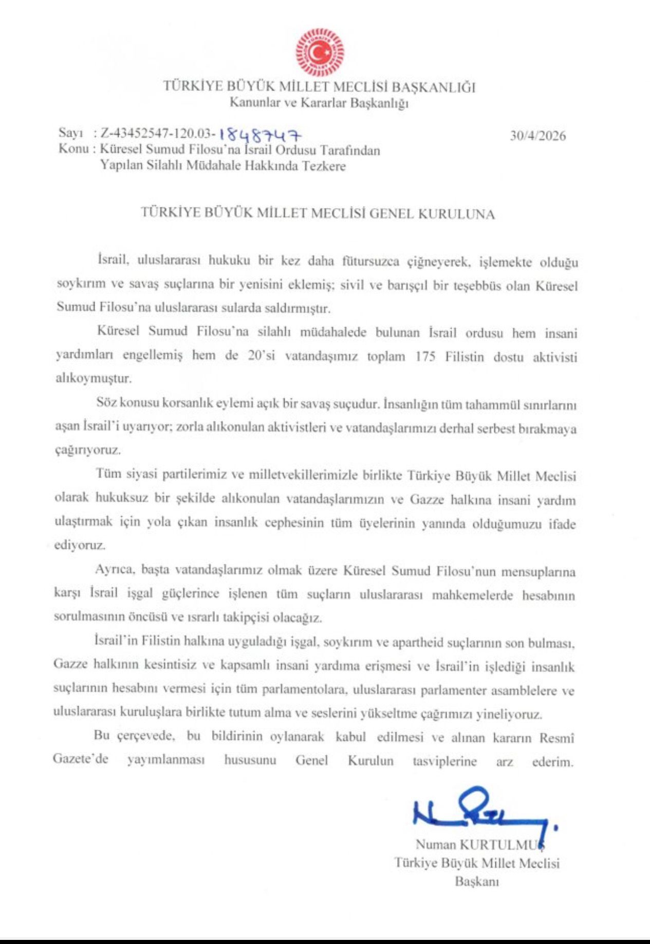 TBMM Başkanı Numan Kurtulmuş’un imzasını taşıyan tezkerede şu ifadelere yer verildi:
