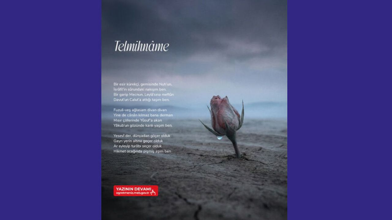 Mehmet ÇEKİÇ’ten “Telmihnâme” şiiri ÖğretmenİZ dergisinde! Bir telmih atlası açılıyor dizelerde… Nuh’un gemisinden İsrâfil’in sûruna, Yûsuf’un kuyusundan Hacı Bektaş’ın nefesine uzanan derin, katmanlı bir yolculuk… “Telmihnâme”; tasavvufun, irfanın ve kadim hikâyelerin şiirle yeniden nefes aldığı bir metin. Mecnun’un çölünde yanıp Yûnus’un diliyle sevmeyi öğrenen bir ses bu. Her mısrada bir gönderme, her göndermede bir arayış saklı. Okumak için http://meb.ai/U3CEsot Sen de kaleminle iz bırak! Şiirlerinle ÖğretmenİZ dergisinde yer al! http://meb.ai/9giDiI #ÖğretmenİZ
