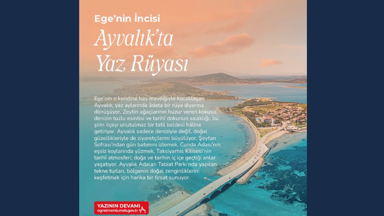 Melis ALTINSOY'dan "Ege'nin İncisi Ayvalık'ta Yaz Rüyası" seyahat yazısı ÖğretmenİZ dergisinde! Doğanın, tarihin ve insan sıcaklığının bütünleştiği Ayvalık'ta bir yaz rüyasına dalın! Okumak için http://meb.ai/UH2c0oy Sen de kalemini al, eserlerinle iz bırak! ÖğretmenİZ dergisi’nde yer al! https://meb.ai/9giDiI #öğretmeniz