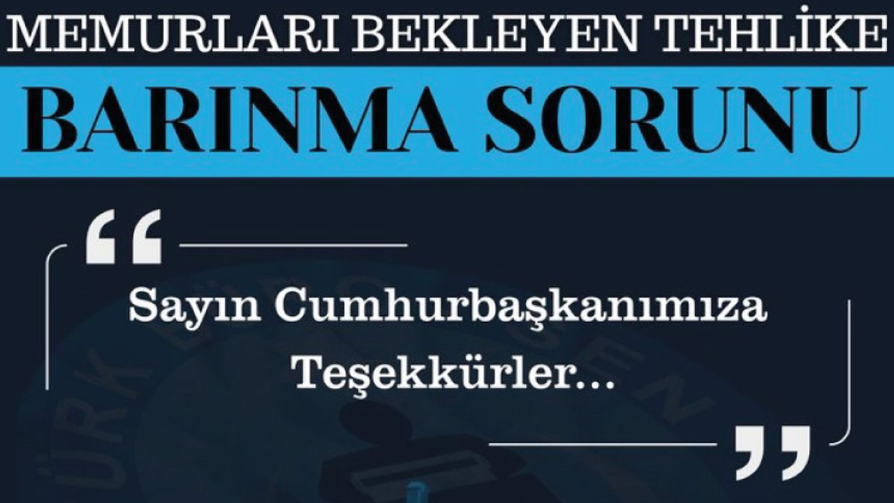 Bu sorunu çözmek üzere, Sn.Cumhurbaşkanımız Recep Tayyip Erdoğan’ın, devletin ilgili kurumlarına memur maaş ve ücretlerinin 1/3 üne tekabül eden taksit tutarında bir ödeme ile, memurlarımıza sosyal konut yapılması talimatı verdiği, bu konuda çalışmaların devam ettiği bilgisi sendikamıza ulaşmıştır. Memurlarımızı bekleyen ve etkileyen barınma sorununun çözümü için ilgili kurumları talimatlandıran Sn.Cumhurbaşkanımıza teşekkürü bir borç biliriz. Allah, devletimize zeval vermesin.