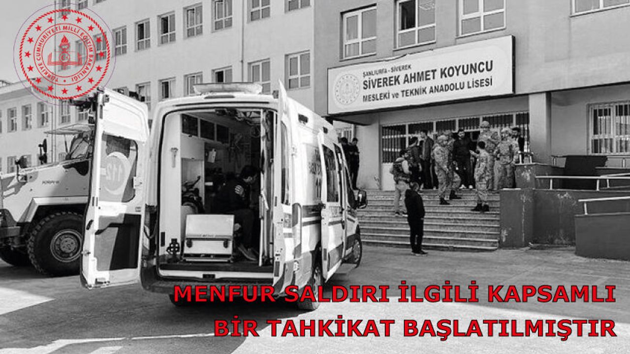 Şanlıurfa’nın Siverek ilçesinde bir lisemizde bu sabah meydana gelen silahlı saldırı, hepimizi derinden sarsmış ve büyük bir üzüntüye sevk etmiştir. Olayda yaralanan vatandaşlarımıza acil şifalar diliyor; öğrencilerimize, öğretmenlerimize, velilerimize ve tüm eğitim camiamıza geçmiş olsun dileklerimi iletiyorum. Yaşanan hadiseyle ilgili gerekli soruşturma ve incelemeler derhâl başlatılmış olup süreç, ilgili kurumlarımızla tam bir koordinasyon içinde ve titizlikle yürütülmektedir. Eğitim ortamlarının güvenliği ve huzuru konusunda hiçbir ihmale müsamaha gösterilmeyecek, benzer hadiselerin bir daha yaşanmaması için gereken tüm tedbirler kararlılıkla alınacaktır.