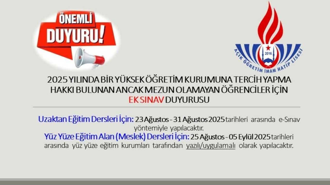 ÖSYM tarafından 2025 Yılında yapılan Yüksek Öğretim Kurumları Sınavı (YKS) sonucuna göre tercih yapma hakkı bulunan ayrıca Millî Savunma Üniversitesi Askeri Aday Belirleme Sınavı (MSÜ) ile Yabancı Uyruklu Öğrenci Sınavı (YÖS) sonuçlarına göre bir yüksek öğretim kurumuna kayıt yaptırma hakkı bulunan veya üniversitelerden kayıt için kabul almış ancak açık öğretim liselerinden mezun olamamış öğrencilere yönelik 2024-2025 eğitim öğretim yılı 4. dönem ek sınavı, Ölçme, Değerlendirme ve Sınav Hizmetleri Genel Müdürlüğünce belirlenen 81 il ve KKTC e-Sınav merkezlerinde 23-31 Ağustos 2025 tarihleri arasında yapılacaktır. Sınav ile ilgili kayıt işlemleri önümüzdeki hafta başlayacak olup detaylı bilgilendirme okullarımızın resmi internet sayfalarında yapılacaktır.