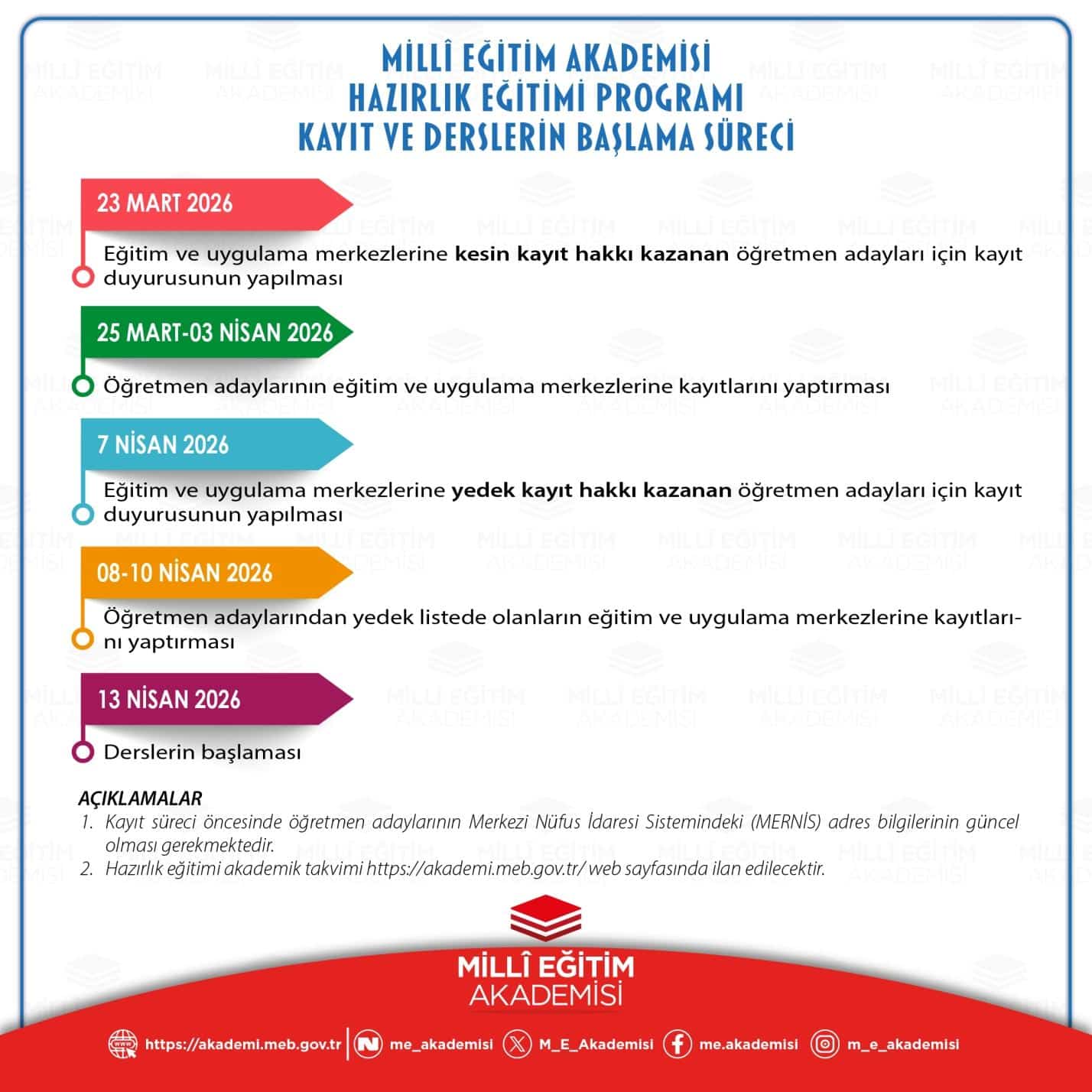 Millî Eğitim Akademisi bünyesinde eğitim ve uygulama merkezlerine kesin kayıt hakkı kazanan öğretmen adayları için kayıt duyurusu, 23 Mart 2026 tarihinde yapılacak.