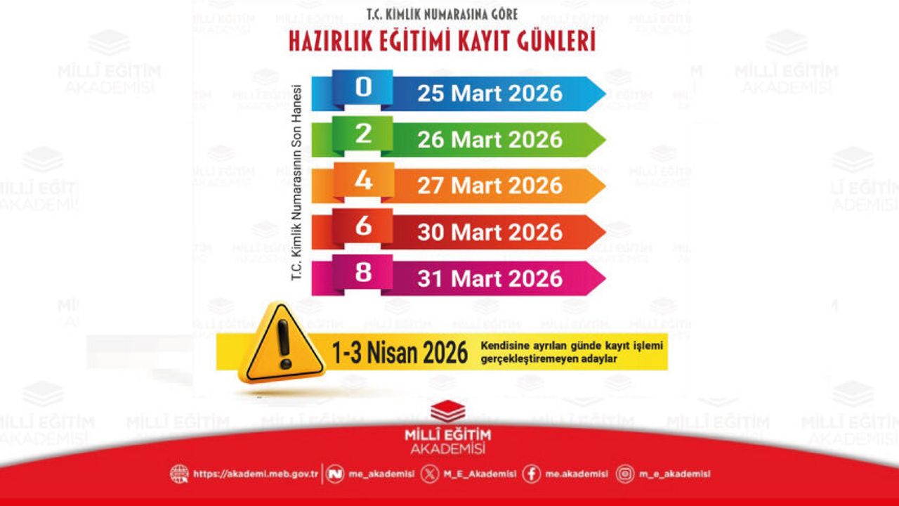 Millî Eğitim Akademisinde hazırlık eğitimine hak kazanan öğretmen adaylarımızın kayıt işlemleri, yoğunluk yaşanmaması için T.C. kimlik numarasının son hanesine göre planlanmıştır.