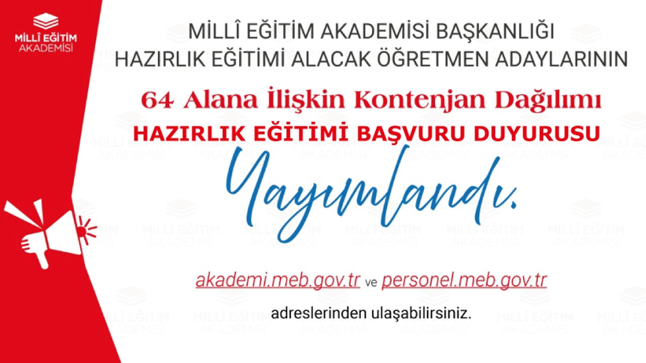 Millî Eğitim Akademisinde hazırlık eğitimine alınacak öğretmen adaylarımız için başvuru sürecine ilişkin duyuru ve branş bazında kontenjan dağılımı açıklandı. Eğitim ailemize hayırlı uğurlu olsun.