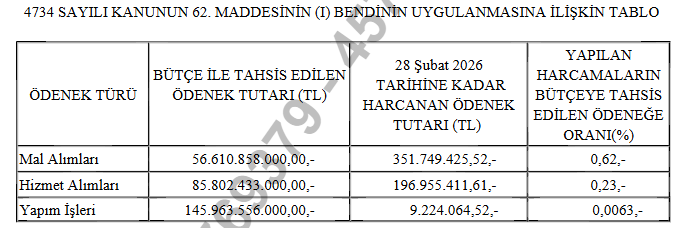 Kamu İhale Kurumu Genel Tebliğine göre, Bakanlığımız 2025 Mali Yılı Bütçesine mal, hizmet alımları ve yapım işleri için tahsis edilen ödenekler ile bu ödeneklerden 28 Şubat 2026 tarihine kadar yapılan harcama bilgileri;