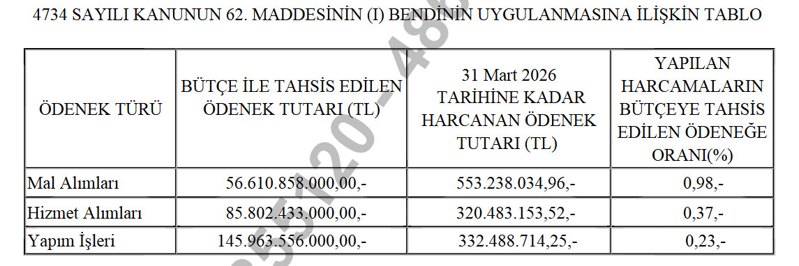 Kamu İhale Kurumu Genel Tebliğine göre, Bakanlığımız 2025 Mali Yılı Bütçesine mal, hizmet alımları ve yapım işleri için tahsis edilen ödenekler ile bu ödeneklerden 31 Mart 2026 tarihine kadar yapılan harcama bilgileri;